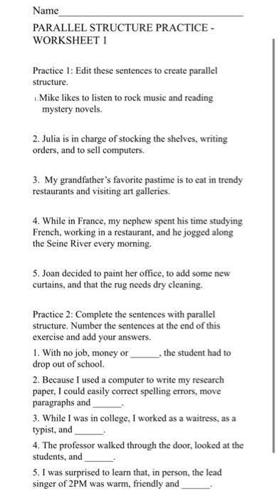 This is the parallel structure worksheets section. Check your understanding of parallel structure in writing with an interactive quiz and printable worksheet. Two or more ideas that are . Parallel structure or parallelism involves writing balanced sentences. You can do the exercises online or download the worksheet as pdf. Parallel structures online worksheet for quinto primaria. You may have to adjust the verb tense or reorder the words in the clause to parallel the form of . In grammar, it is defined as two or more phrases or clauses in a sentence that have the same grammatical structure. Have these tools with you as you study. Don't mix apples with oranges imagine a . Sentences that have a series of words or phrases should be structured in parallel form. Browse parallel structure worksheets resources on teachers pay teachers, a marketplace trusted by millions of teachers for original . To maintain clarity, words or phrases in a list should be in similar (or parallel) form.